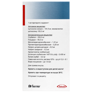 Вспомогательные вещества: сорбитол 2 000,0 мг, глицерол 500,0 мг, метилпарагидроксибензоат 14,5 мг, пропилпарагидроксибензоат 2,5 мг, натрия цитрата дигидрат 60,0 мг, натрия сахаринат 2,0 мг, ароматизатор клубничный [эссенция клубничная 1487-S-Lucta] 4,08 мг, калия сорбат 30,0 мг, лимонная кислота раствор 50 % до pH 5,9–6,1, вода очищенная до 10,0 мл.