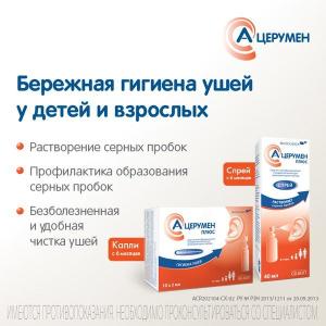 «А-Церумен Плюс» (A-Cerumen Plus) - средство многофункциональное отоларингологическое для промывания ушного прохода. А-Церумен Плюс - современная гигиена ушей и помощь в растворении серных пробок.