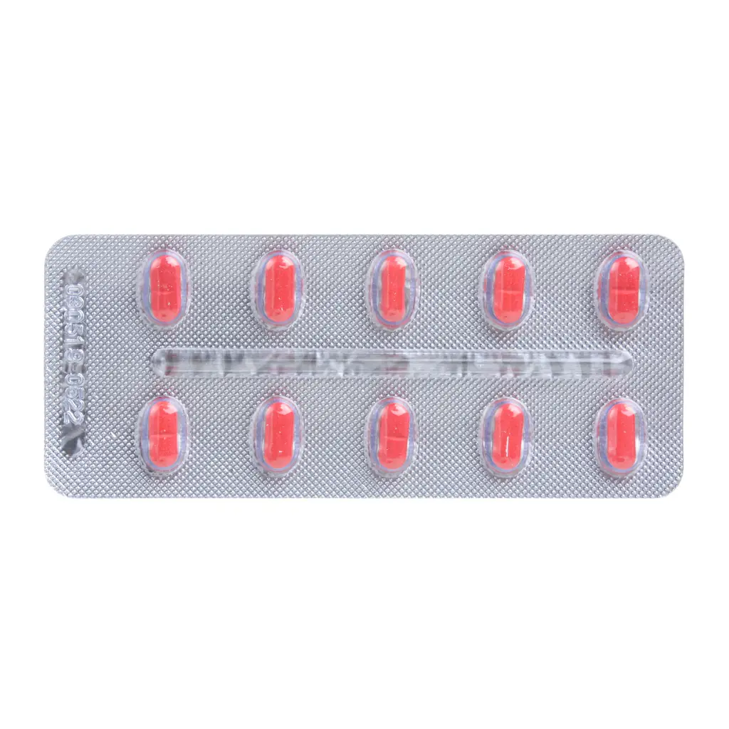 Продолговатые таблетки, покрытые плёночной оболочкой красного цвета, с риской на одной стороне. На изломе — ядро таблетки белого или почти белого цвета.