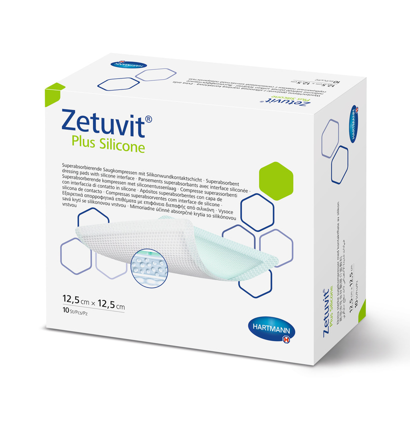 Zetuvit Plus Silicone - это одноразовая стерильная суперабсорбирующая повязка с силиконовым интерфейсом для длительного лечения травмированной кожи, острых и хронических ран, с умеренным и высоким уровнем экссудата. Он используется только для взрослых, медицинскими работниками в клинических условиях или на дому и может сочетаться с местными антисептиками, первичными и вторичными повязками, а также под компрессией.