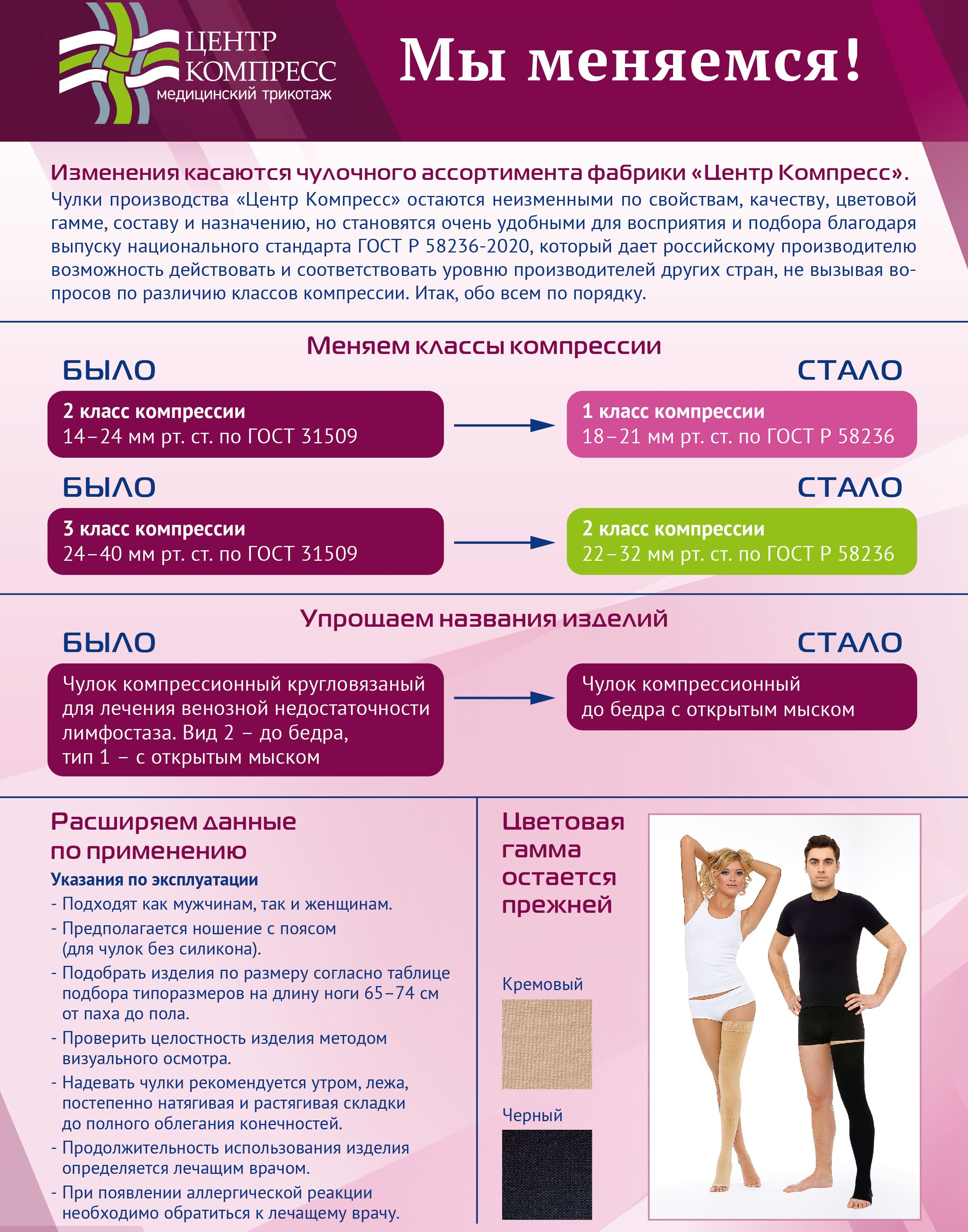 Чулок компрессионный до колена II компрессии предназначен для лечения варикозного расширения вен нижних конечностей, лимфостаза, посттравматических осложнений нижних конечностей, при артрозе и артрите, при отеках после снятия гипсовой повязки, а также для профилактики тромбоэмболии в до- и послеоперационный период.