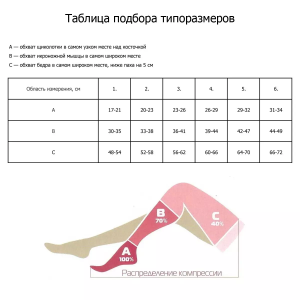 ВАЖНО! Измерение участков нужно проводить утром до появления отёчности на ногах. Размер изделия подбирать по таблице подбора и согласно конструктивным особенностям конечности, так как изделия разработаны на длину ноги от 65 до 74 см. Компрессия на ноге распределена градуировано, максимальное давление в области щиколотки, минимальное в области бедра.