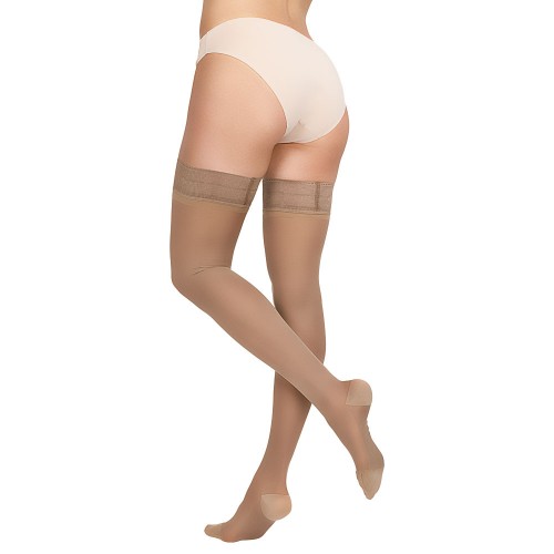 Чулки полупрозрачные 1 класса компрессии (18-22 мм рт.ст.) с ажурным верхом на силиконовой ленте, с укрепленными носком и пяткой предназначены для лечения и профилактики заболеваний вен и лимфатических отеков нижних конечностей.