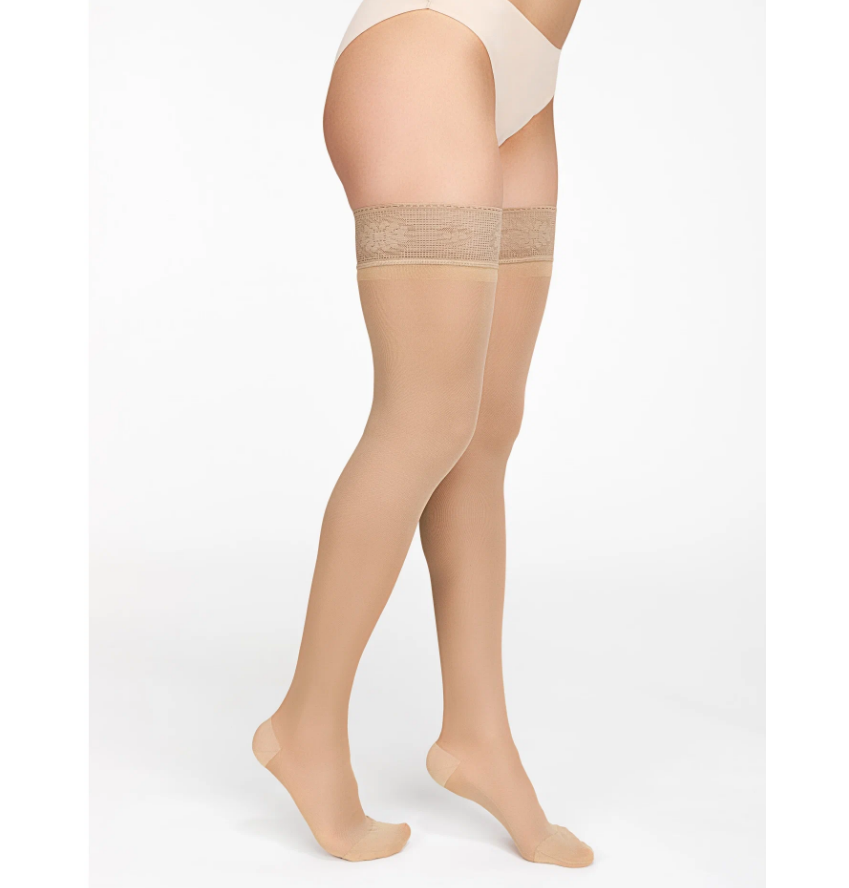 Чулки полупрозрачные 2 класса компрессии (23-32 мм рт.ст.) с ажурным верхом на силиконовой ленте, с укрепленными носком и пяткой.