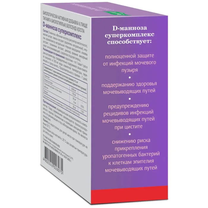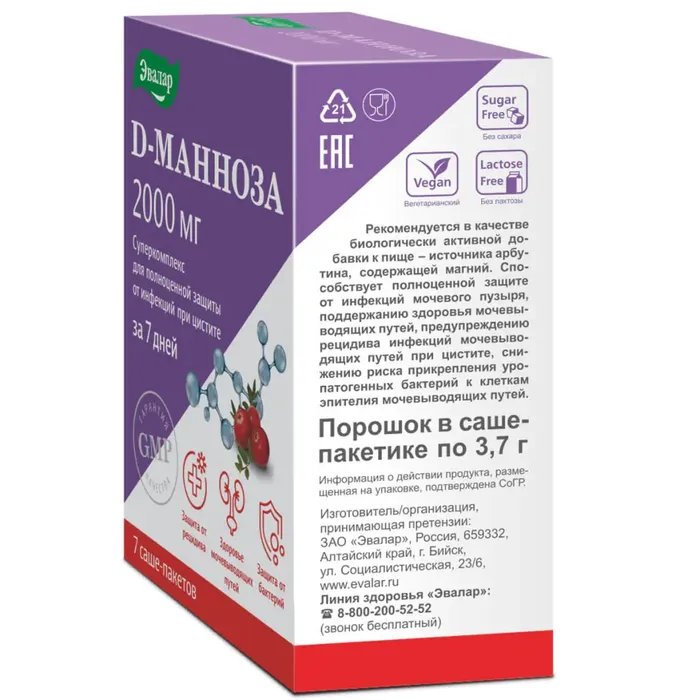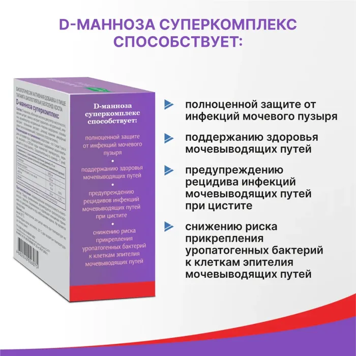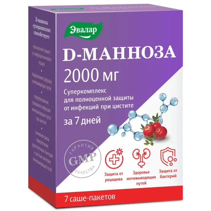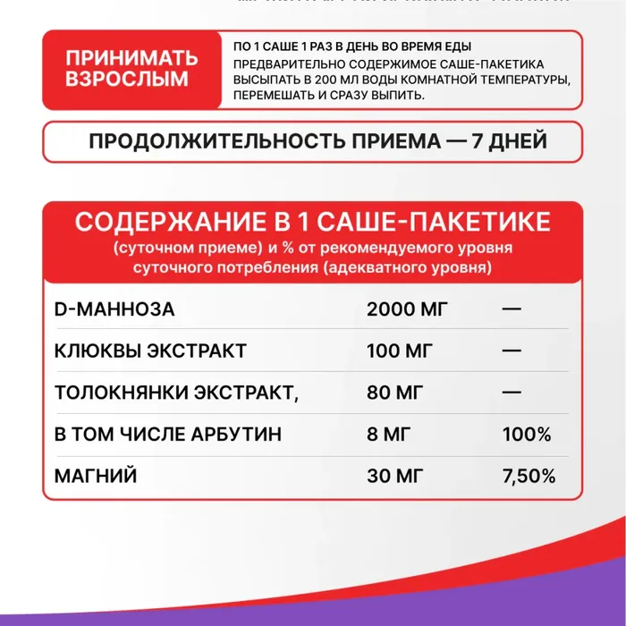 - Высокая дозировка d-маннозы (2000 мг) в одном саше