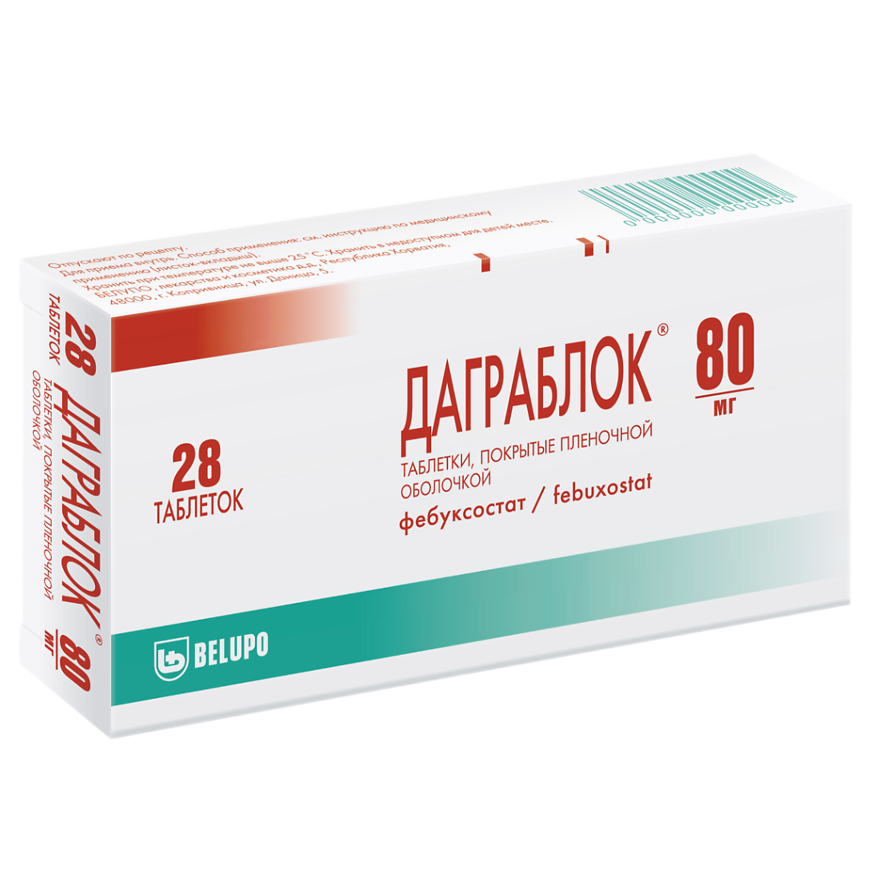 Действующим веществом препарата Даграблок® является фебуксостат, который относится к группе противоподагрических средств — ингибиторов ксантиноксидазы. Фебуксостат используется для лечения подагры — заболевания, связанного с избыточным накоплением мочевой кислоты (уратов) в организме.