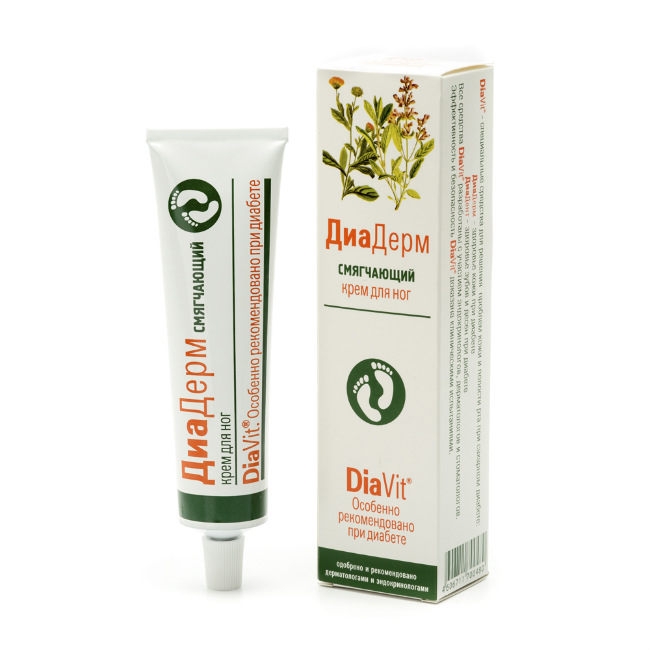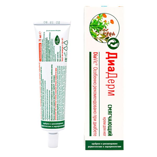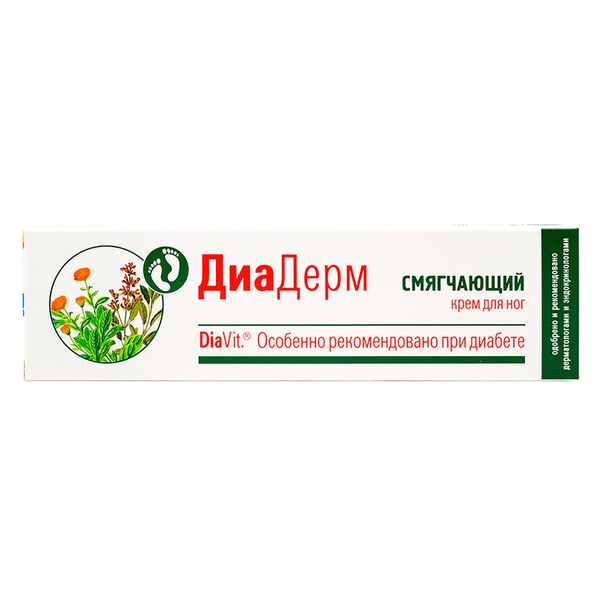 Крем ДиаДерм Смягчающий особенно рекомендован для людей с диабетом. Эффективно питает, увлажняет и смягчает кожу ног, уменьшает сухость, шелушение и интенсивность зуда, Крем ДиаДерм Смягчающий вернет ощущение комфорта и увлажненности коже ног, потому что в составе - богатый комплекс натуральных ингредиентов: