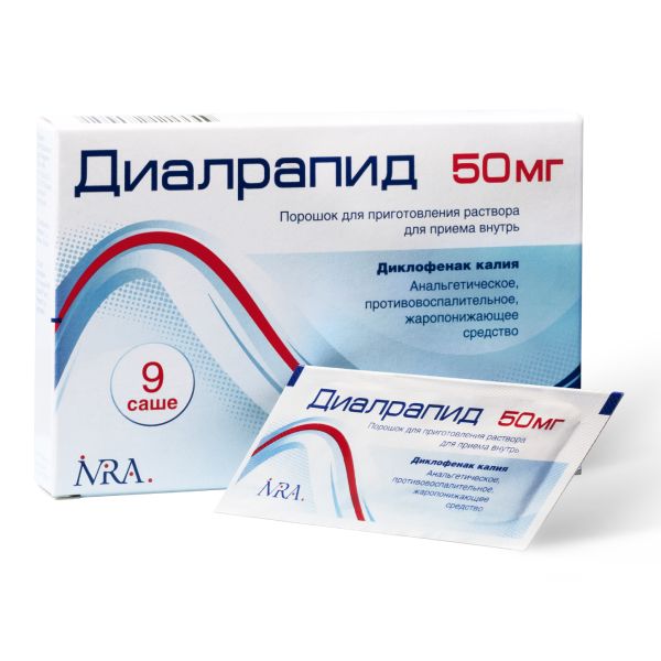 Препарат Диалрапид содержит диклофенак калия, вещество нестероидной структуры, оказывающее выраженное анальгезирующее, противовоспалительное и жаропонижающее действие.