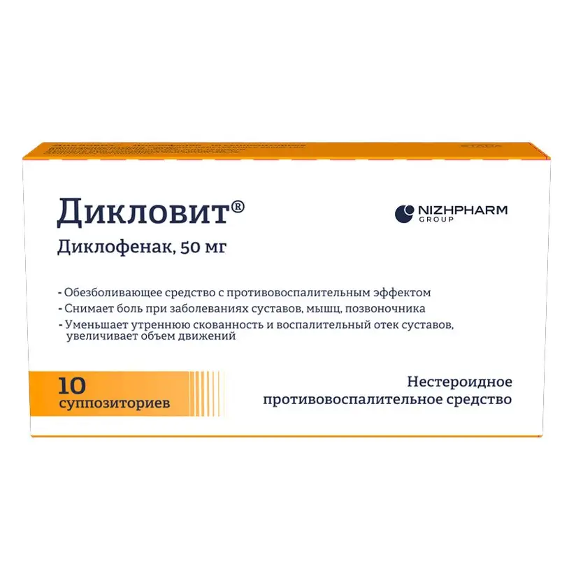 Один суппозиторий содержит: действующее вещество -диклофенак натрия - 50 мг основа для суппозиториев — жир твердый (Витепсол марки Н 15, W 35, Суппосир марки NA 15, NAS 50) - до получения суппозитория массой 1,26 г.