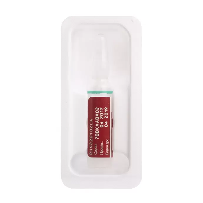 По 1 или 5 ампул в пластиковой контурной ячейковой упаковке вместе с инструкцией по применению в картонной пачке.