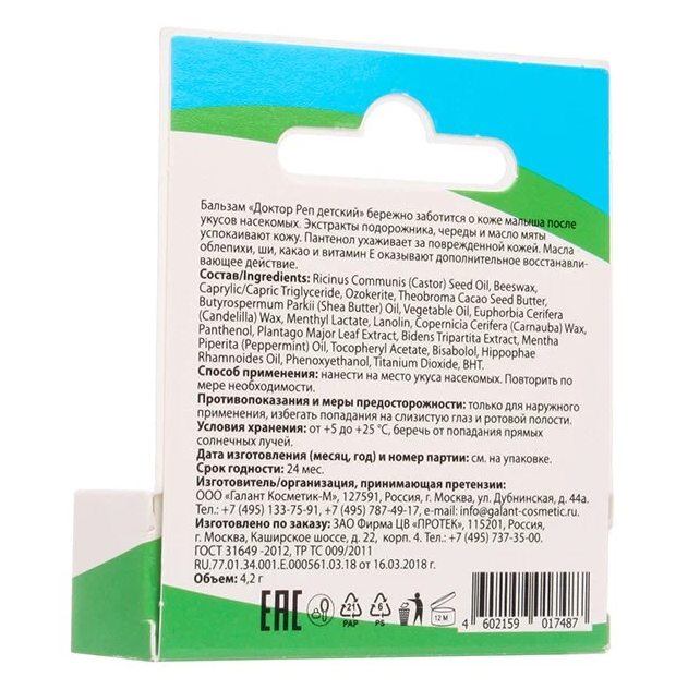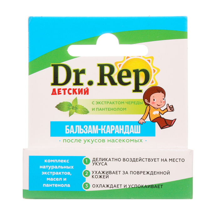 Бальзам после укусов «Доктор Реп детский» бережно заботится о коже малыша после укуса насекомых. Комплекс натуральных экстрактов, масел и пантенола. Снимает зуд после укусов. Охлаждает и успокаивает кожу. Предотвращает расчесывание и уменьшает покраснение. Бальзам после укусов Доктор Реп содержит активный комплекс натуральных экстрактов и масел. Масло мяты, экстракты подорожника и череды - успокаивают кожу. Пантенол - снимает зуд, уменьшает воспаление и покраснение. Масла облепихи, ши, какао и витамин Е - оказывают дополнительное восстанавливающее действие. Скорая помощь после укусов комаров, мошек, слепней.