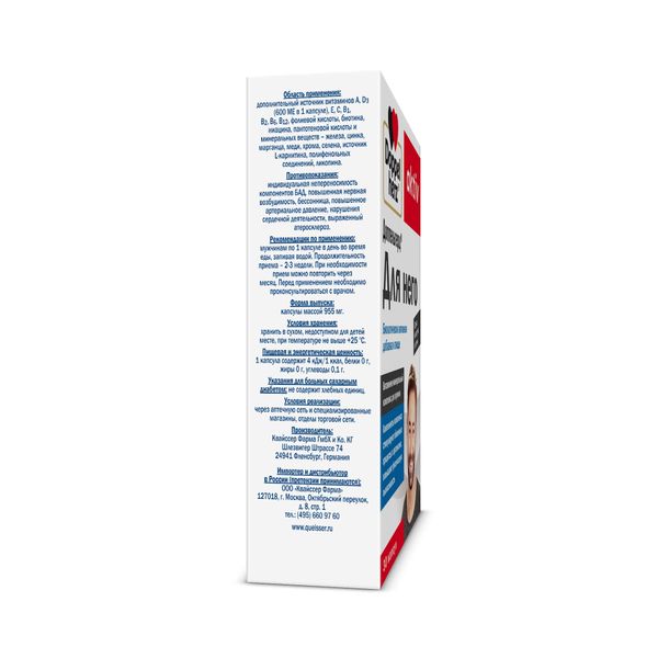 Рекомендуется в качестве биологически активной добавки к пище — дополнительного источника витаминов А, D3 (600 МЕ в 1 капсуле), Е, С, В1, В2, В6, В12, фолиевой кислоты, биотина, ниацина, пантотеновой кислоты и минеральных веществ – железа, цинка, марганца, меди, хрома, селена, источник L-карнитина, полифенольных соединений, ликопина.