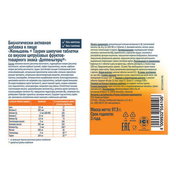 Доппельгерц актив Женьшень + Таурин таблетки шипучие со вкусом цитрусовых фруктов массой 6,5г №15