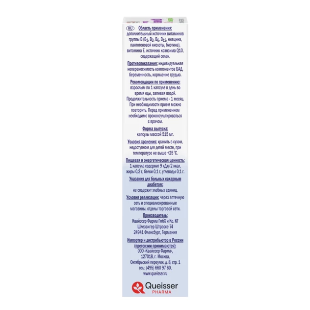 Масло соевых бобов, коэнзим Q10, желатин, глицерин (агент влагоудерживающий), кокосовое масло, D-альфа-токоферол (витамин Е), никотинамид (ниацин), вода, D-пантотенат кальция (пантотеновая кислота), лецитины (из сои) (эмульгатор), моно- и диглицериды жирных кислот (эмульгатор), сорби-товый сироп (подсластитель), цианокобаламин (витамин В12), рибофлавин (витамин В2), пиридокси-на гидрохлорид (витамин В6), тиамина мононитрат (витамин В1), оксиды и гидроксиды железа (красители), D-биотин, натрия селенит (селен).