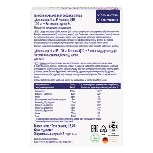 Доппельгерц V.I.P. Коэнзим Q10 100мг + Витамины группы В капсулы массой 515мг №30