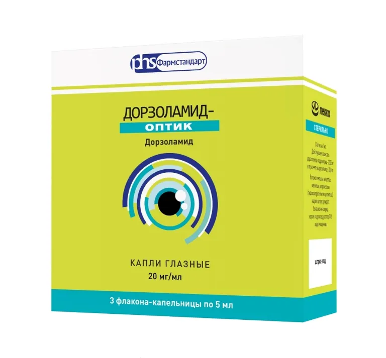 Действующее вещество: Дорзоламида гидрохлорид 22,26 мг в пересчёте на дорзоламид 20,0 мг.