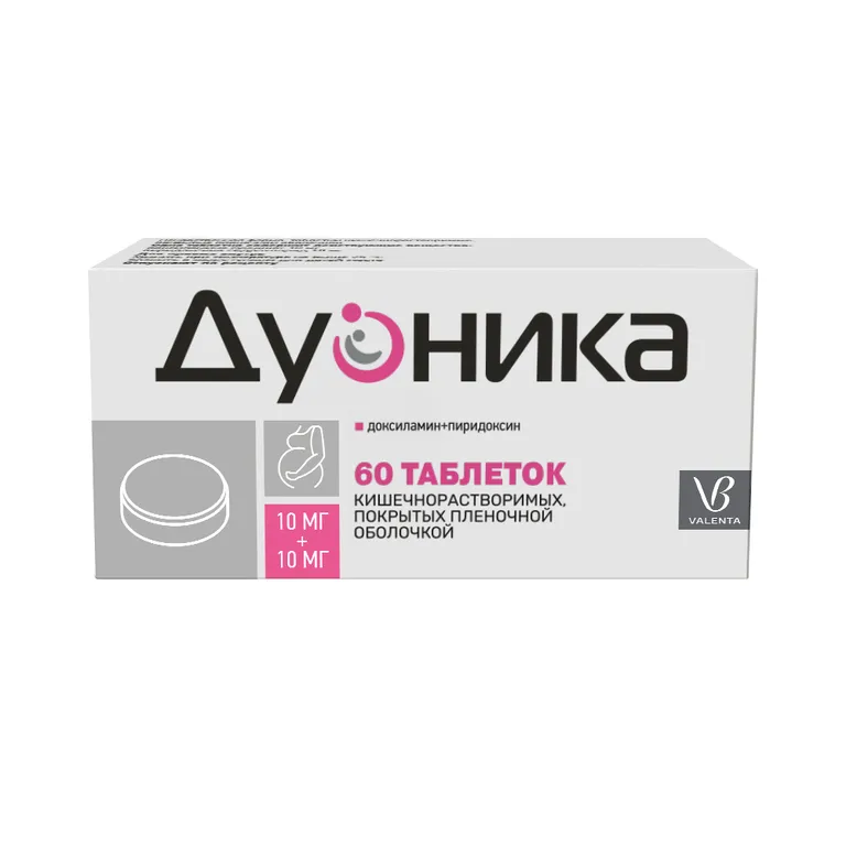 Препарат Дуоника® является комбинированным препаратом, содержащим два действующих вещества: доксиламин (в виде сукцината) и пиридоксин (в виде гидрохлорида).