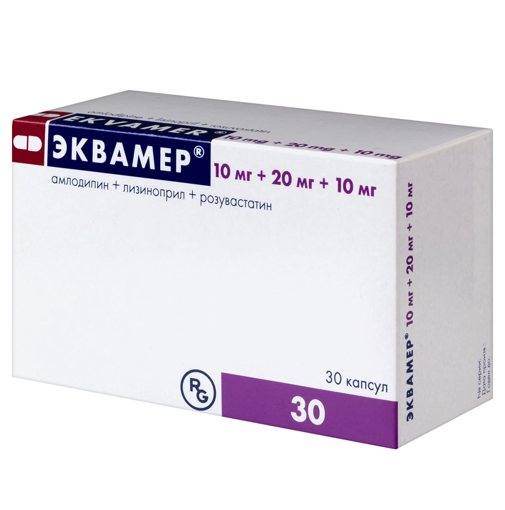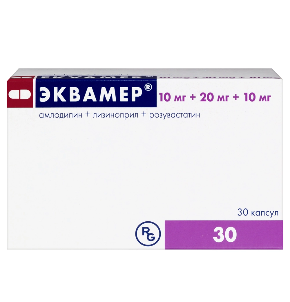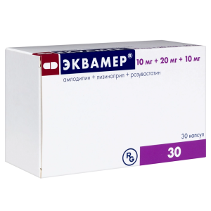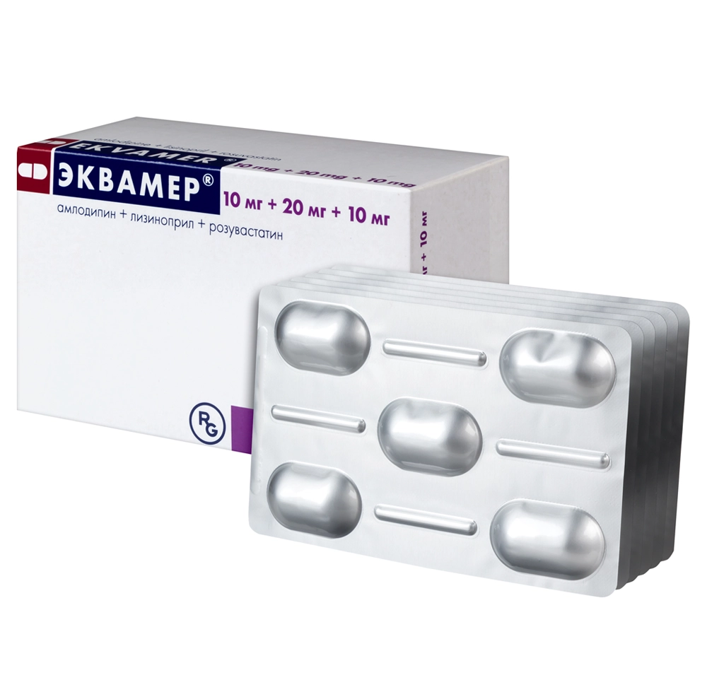 Эквамер® — комбинированный гипотензивный и гиполипидемический препарат. В состав препарата Эквамер® входят три действующих вещества — амлодипин, лизиноприл и розувастатин. Механизм действия препарата Эквамер® основан на фармакологических свойствах действующих веществ.