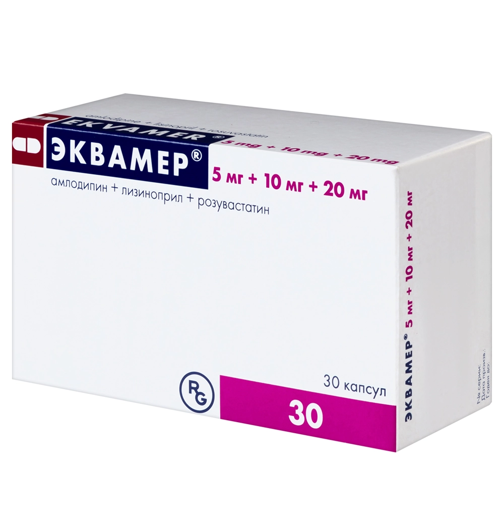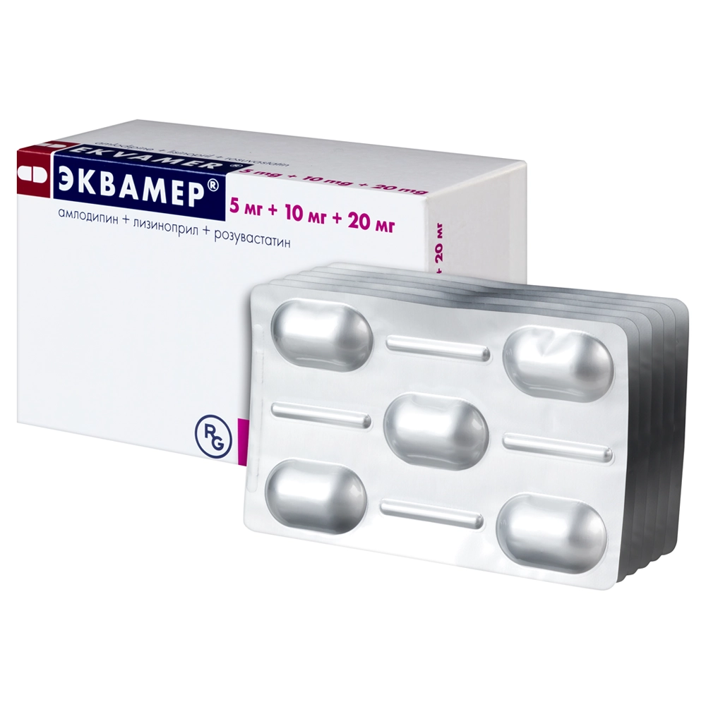 Эквамер® — комбинированный гипотензивный и гиполипидемический препарат. В состав препарата Эквамер® входят три действующих вещества — амлодипин, лизиноприл и розувастатин. Механизм действия препарата Эквамер® основан на фармакологических свойствах действующих веществ.