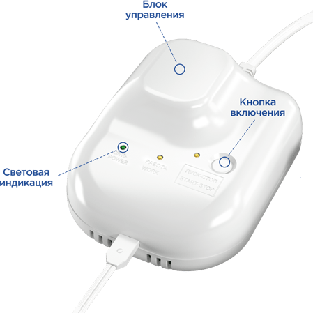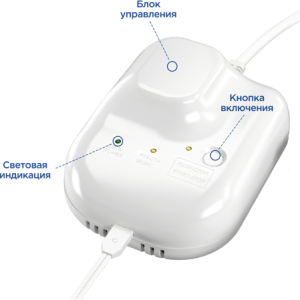 Устройство состоит из источника питания, сетевого шнура и аппликатора с кабелем пациента. На источнике питания расположены: индикаторы «СЕТЬ», «ПУСК-СТОП», «РАБОТА» и кнопка «ПУСК-СТОП». Индикатор «СЕТЬ» свидетельствует о включении устройства в сеть электропитания. Подключение аппликатора к источнику питания сигнализируется свечением индикатора «РАБОТА». Кнопка «ПУСКСТОП» включает/выключает рабочий режим (тепло, магнитное поле и вибрация) аппликатора. При нажатии кнопки «ПУСК-СТОП» загорается индикатор «ПУСК-СТОП», индикатор «РАБОТА» (при наличии подключенного аппликатора к источнику питания устройства) и запускается таймер, определяющий длительность цикла работы устройства. По окончании цикла работы или при повторном нажатии кнопки «ПУСК-СТОП» работа аппликатора прекращается, индикаторы «ПУСК-СТОП» и «РАБОТА» гаснут.