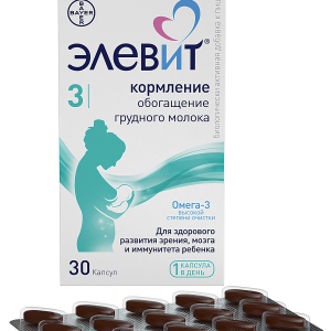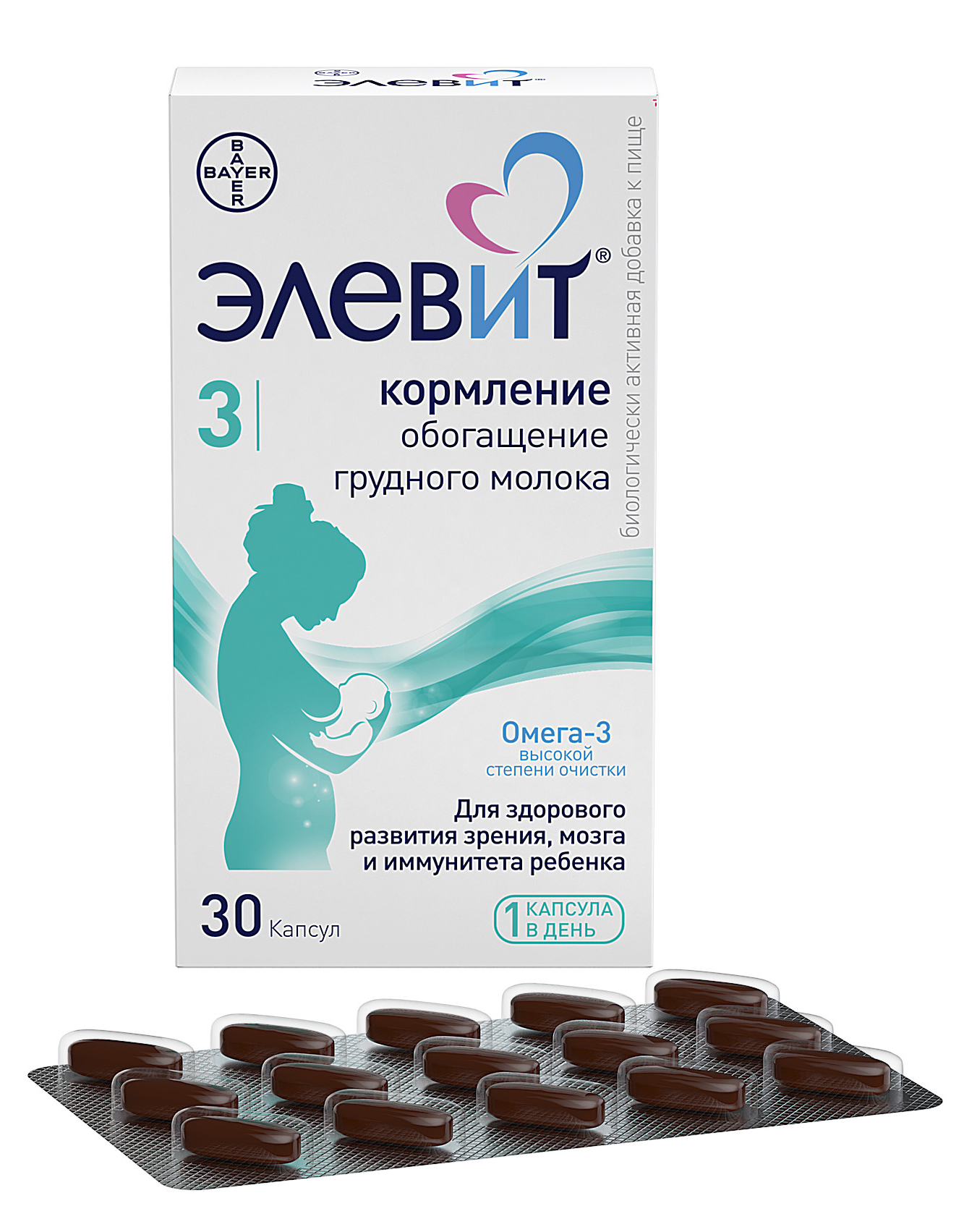Элевит® 3 - Элевит® Кормление БАД к пище. Рекомендован в период кормления грудью для обогащения грудного молока жизненно важными микронутрентами. Содержит омега-3 высокой степени очистки, а также 12 витаминов и 5 микроэлементов в 1 капсуле. Способствует здоровому развитию зрения, мозга и иммунитета ребенка после рождения.