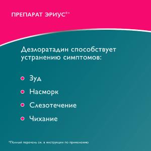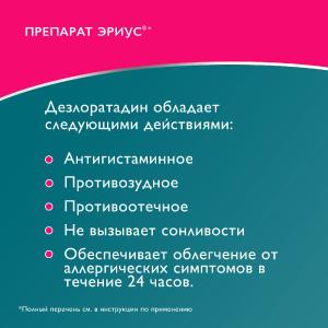 Действие Эриуса® начинается в течение 30 мин после приёма внутрь и продолжается в течение 24 ч.