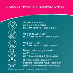 Эффективность и безопасность применения лекарственного препарата Эриус® раствора для приема внутрь у детей в возрасте до 6 мес не установлена.