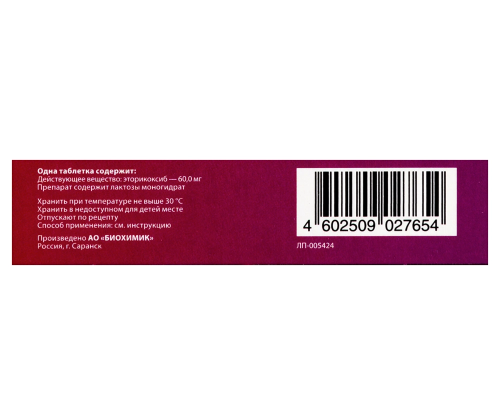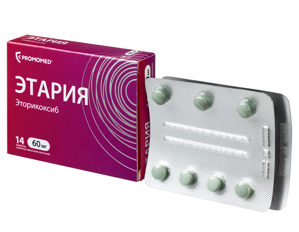 НПВП. Эторикоксиб является селективным ингибитором циклооксигеназы-2 (ЦОГ-2), в терапевтических концентрациях блокирует образование простагландинов и обладает противовоспалительным, анальгезирующим и жаропонижающим действием. Селективное угнетение ЦОГ-2 эторикоксибом сопровождается уменьшением выраженности клинических симптомов, связанных с воспалительным процессом, при этом отсутствует влияние на функцию тромбоцитов и слизистую оболочку желудочно-кишечного тракта. Эторикоксиб обладает дозозависимым эффектом ингибирования ЦОГ-2, не оказывая влияния на ЦОГ-1 при применении суточной дозы до 150 мг. Препарат не оказывает влияния на выработку простагландинов в слизистой оболочке желудка и время кровотечения. В проведённых исследованиях не наблюдалось снижения уровня арахидоновой кислоты и агрегации тромбоцитов, вызываемой коллагеном.