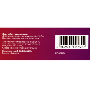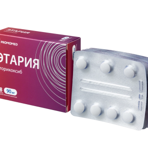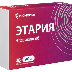 НПВП. Эторикоксиб является селективным ингибитором циклооксигеназы-2 (ЦОГ-2), в терапевтических концентрациях блокирует образование простагландинов и обладает противовоспалительным, анальгезирующим и жаропонижающим действием. Селективное угнетение ЦОГ-2 эторикоксибом сопровождается уменьшением выраженности клинических симптомов, связанных с воспалительным процессом, при этом отсутствует влияние на функцию тромбоцитов и слизистую оболочку желудочно-кишечного тракта. Эторикоксиб обладает дозозависимым эффектом ингибирования ЦОГ-2, не оказывая влияния на ЦОГ-1 при применении суточной дозы до 150 мг. Препарат не оказывает влияния на выработку простагландинов в слизистой оболочке желудка и время кровотечения. В проведённых исследованиях не наблюдалось снижения уровня арахидоновой кислоты и агрегации тромбоцитов, вызываемой коллагеном.