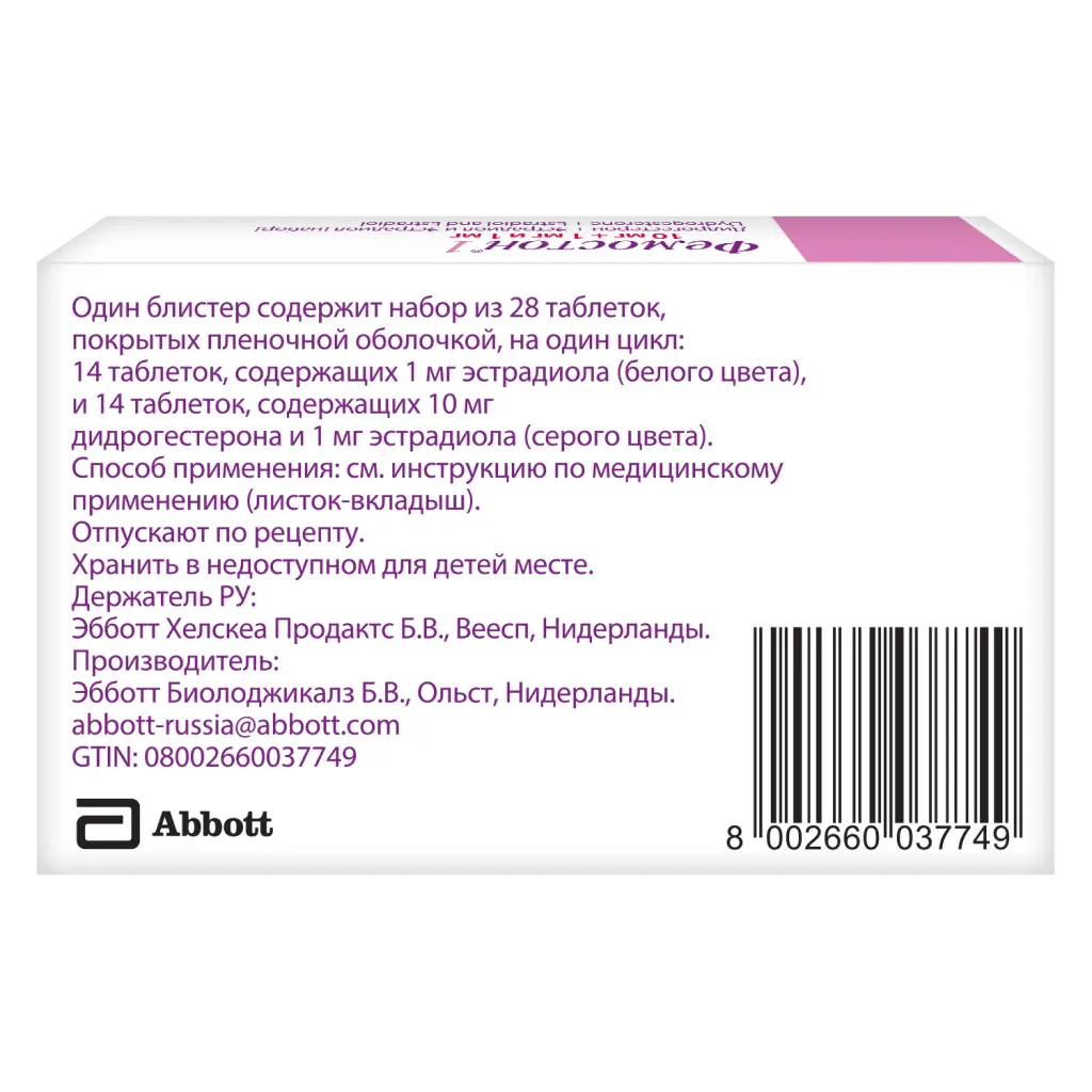 Активные вещества: эстрадиола гемигидрата — 1,03 мг (в пересчёте на эстрадиол — 1,0 мг) и дидрогестерона 10 мг