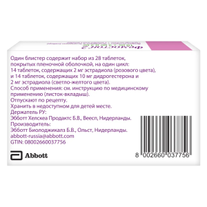 По 14 таблеток 2 мг эстрадиола и 14 таблеток 2 мг эстрадиола/10 мг дидрогестерона в блистер из ПВХ/ПВДХ/Ал фольги.