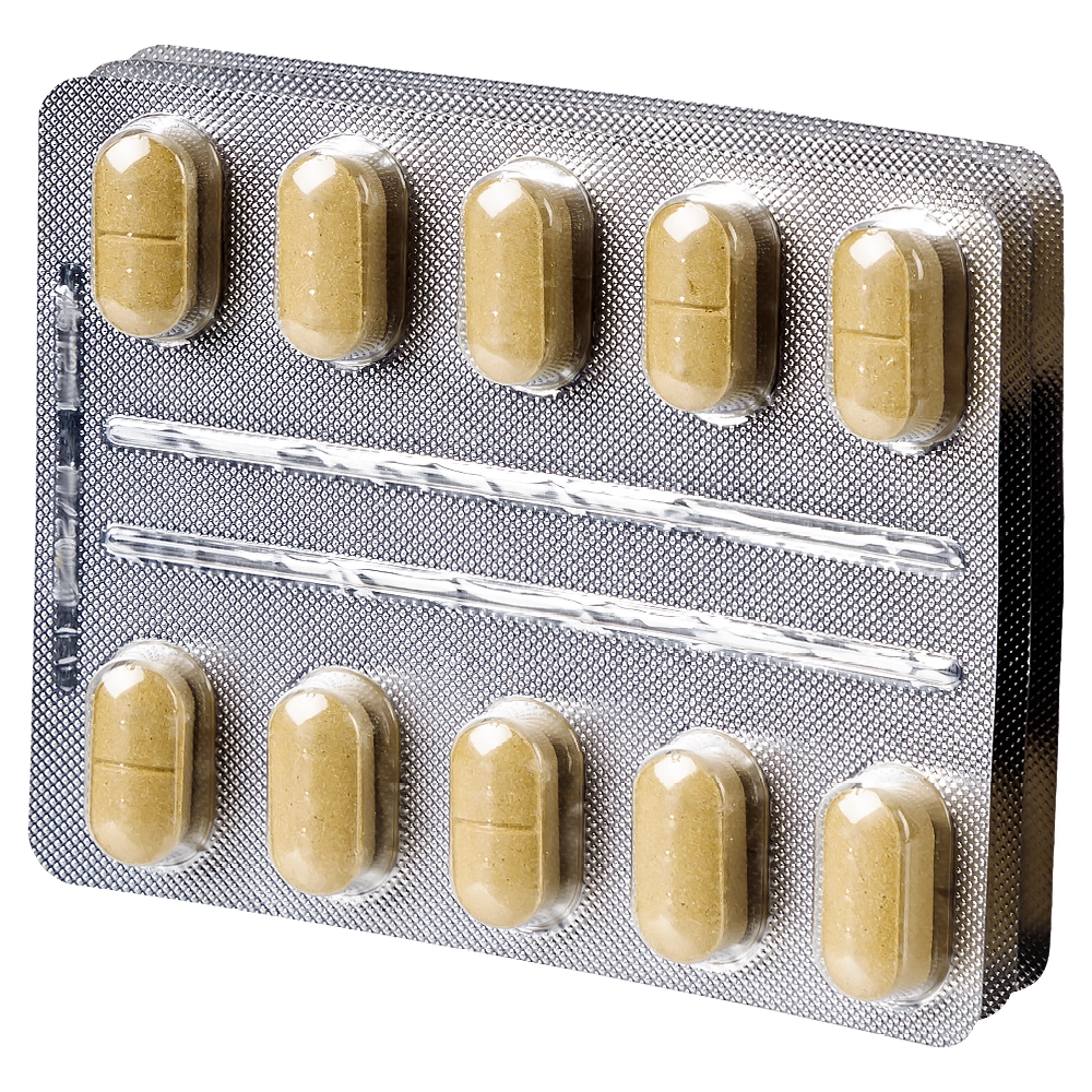Продолговатые двояковыпуклые таблетки с риской с одной стороны, от серовато-коричневого до серовато-желтого цвета, допускаются вкрапления более светлого и темного оттенков.
