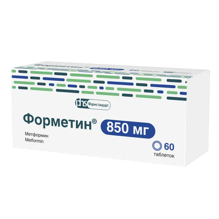 Активное вещество: метформина гидрохлорид — 0,500 г 0,850 г 1.000 г.