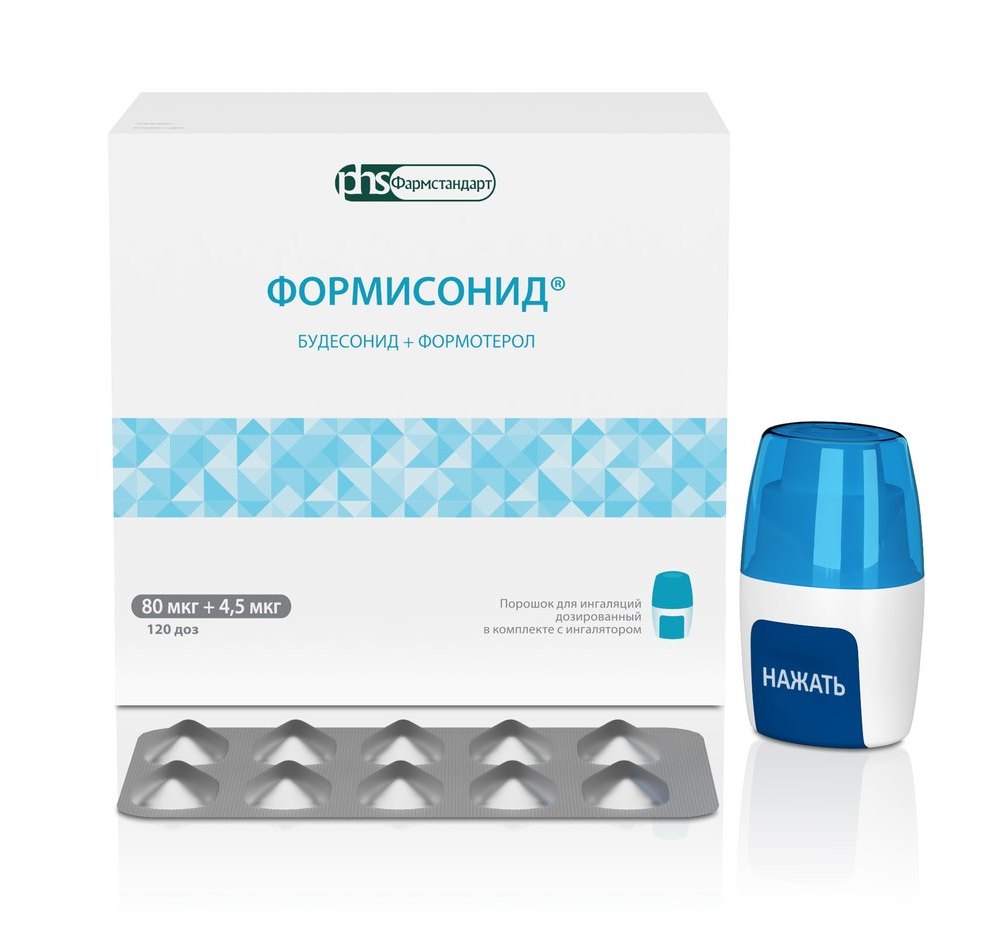 Формисонид® содержит будесонид и формотерол, которые имеют разные механизмы действия и проявляют аддитивный эффект в отношении снижения частоты обострений бронхиальной астмы. Особые свойства будесонида и формотерола дают возможность использовать их комбинацию для купирования приступов/симптомов с противовоспалительным действием, или как поддерживающую терапию бронхиальной астмы.