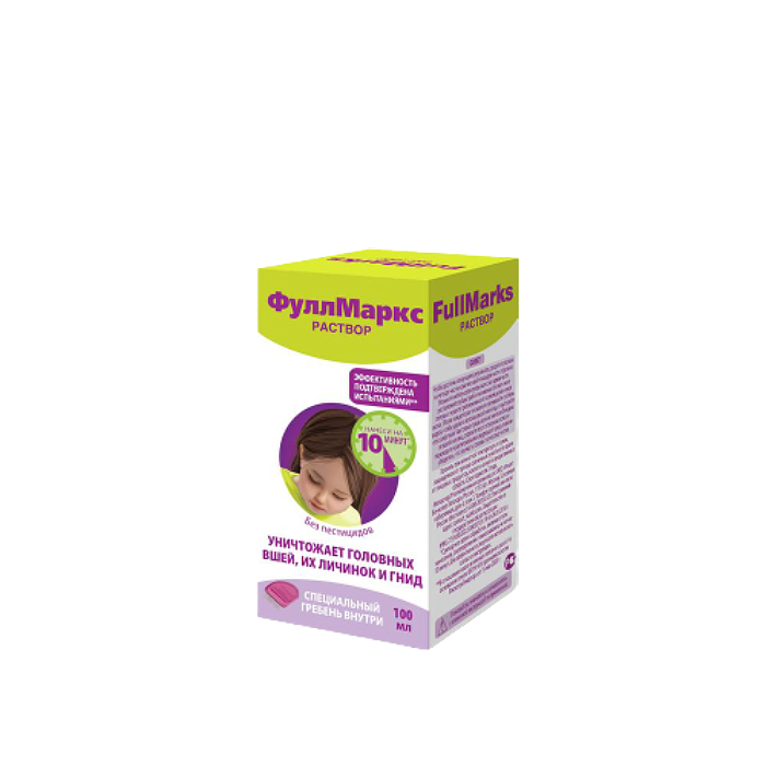 Раствор Full Marks оказывает физическое воздействие на вшей, приводя к их дегидратации (обезвоживанию) и смерти. В отличие от сопротивляемости вшей некоторым пестицидам, которые используются в других средствах, в настоящее время не выявлены механизмы сопротивляемости головных вшей эффекту обезвоживания! После применения, Вы сможете удалить мертвых вшей и их яйца гребнем Full Marks для вычесывания. Каждый курс обработки требует примерно 50 мл раствора. Благодаря отсутствию сильного запаха раствор Full Marks приятнее в использовании.
