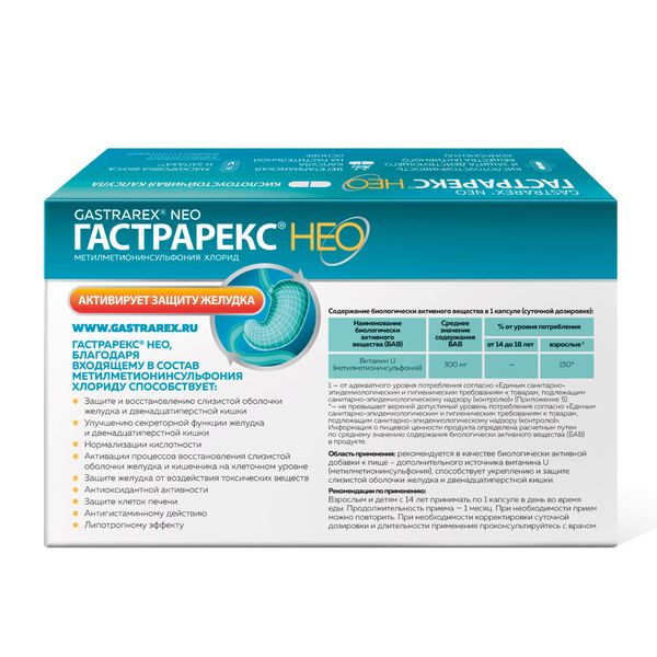 Гастрарекс® НЕО благодаря входящему в его состав метилметионинсульфония хлориду способствует укреплению и защите слизистой оболочки желудка и двенадцатиперстной кишки от влияния агрессивных факторов — эндогенных и экзогенных токсических веществ различной природы (результатов погрешности в питании, приема алкоголя, негативных последствий приема лекарственных препаратов, в т.ч. НПВП, воздействия бактерий и бактериальных токсинов, в т.ч. спиралевидной грамотрицательной бактерии, обитающей в желудке, токсичных результатов обмена веществ, в т.ч. избытка билирубина, мочевины, холестерина и липидных комплексов, а также метаболитов, ответственных за развитие эндогенного токсикоза)1,4,9,14,19,21 нормализации повышенной или пониженной кислотности желудочного сока2,13,16,17 улучшению секреторной функции желудка и двенадцатиперстной кишки, стимуляции защитного слоя слизистой желудка и кишечника1,3,18 нормализации моторики желудка и кишечника, не вызывая атонию4 активации процессов восстановления в слизистой оболочке желудка и кишечника на клеточном уровнее3,4,16 уменьшению проявления дискомфорта в ЖКТ11,12,13 улучшению углеводного, белкового и липидного обмена в печени5,6,7,8 очищению слизистой оболочки от гидроксильных радикалов и подавлению супероксидазы4 предупреждению хронических интоксикаций4 антиоксидантной активности через замедление процессов перекисного окисления липидов3,4,9 проявлению антигистаминных свойств27,28 ускоренной регенерации кожных покровов23,24, нормализации обмена жиров, что предотвращает жировое перерождение печени и повреждение кровеносных сосудов22 является донором метильных групп при синтезе креатина и холина15,28 улучшает состояние кожи, а также придает ей здоровый вид23,24 содержит натуральные активные компоненты19 участвует в метаболизме на клеточном уровне3,15.