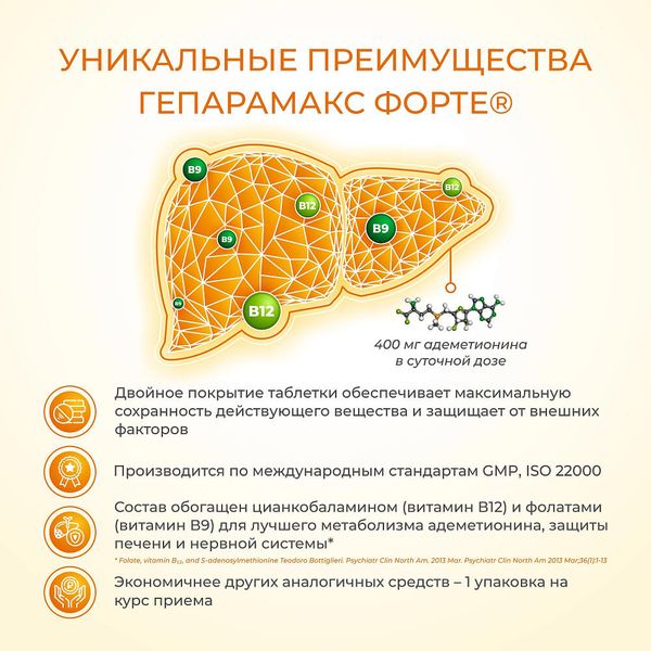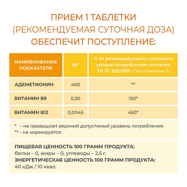 Рекомендуется в качестве биологически активной добавки к пище – дополнительного источника витаминов В9, В12, содержит Ѕ-Аденозил-L-метионина Дисульфата Тозилат. Ѕ-Аденозил-Lметионина Дисульфата Тозилат способствует защите клеток печени, обладает также антидепрессивной активностью.