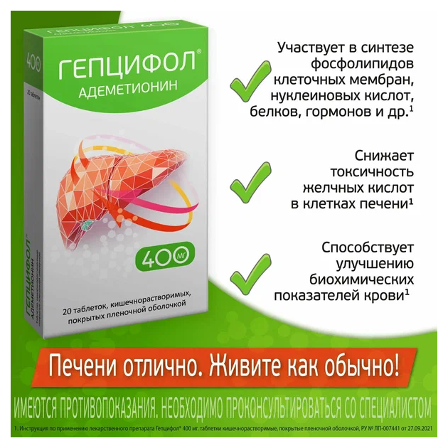 Желчегонный и гепатопротекторный эффект сохраняется до 3 месяцев после прекращения лечения. Показана эффективность при гепатопатиях, обусловленных различными гепатотоксичными препаратами. В ряде исследований была подтверждена эффективность адеметионина при лечении повышенной утомляемости у пациентов с хроническими заболеваниями печени.
