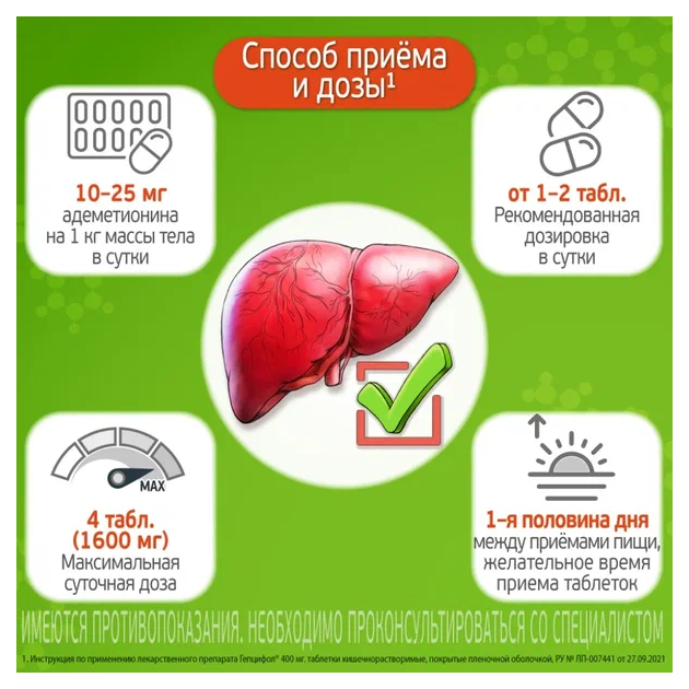 Обычно суточная доза составляет 1–2 таблетки в сутки (от 400–800 мг адеметионина в сутки) и может быть увеличена до 4 таблеток в сутки (до 1600 мг адеметионина в сутки). Эффект обычно проявляется через 7–14 дней лечения и сохраняется при дальнейшем применении препарата.