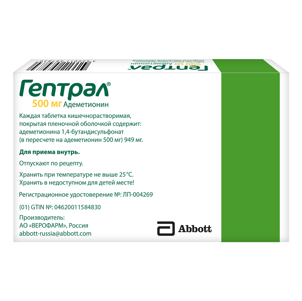 Таблетки препарата Гептрал® следует вынимать из блистера непосредственно перед приёмом внутрь. В случае если таблетки имеют цвет, отличный от белого до светло-желтого цвета (вследствие негерметичности алюминиевой фольги), препарат Гептрал® использовать не рекомендуется.