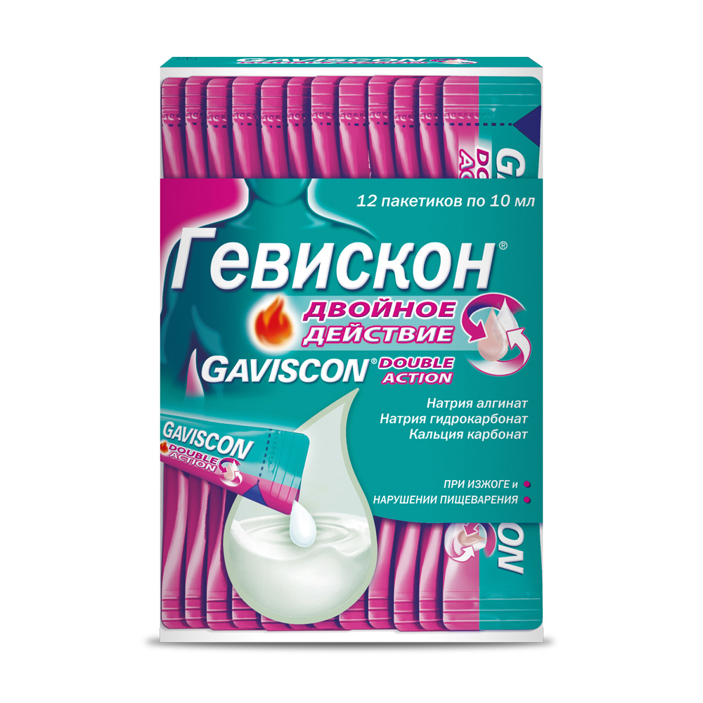При приеме внутрь действующие вещества препарата Гевискон®Двойное Действиебыстро реагируют с кислым содержимым желудка. При этом образуется гель алгината со значением рН, близким к нейтральному. В течение трех минут гель образует защитный барьер на поверхности содержимого желудка, препятствуя возникновению гастроэзофагеального рефлюкса (обратному забросу содержимого желудка в пищевод) на период до четырех часов. В тяжелых случаях рефлюкса (регургитации), гель попадает в пищевод, опережая остальное желудочное содержимое, где он уменьшает раздражение слизистой оболочки пищевода. Кальция карбонат быстро нейтрализует соляную кислоту желудочного сока, облегчая ощущение изжоги. Этот эффект усиливается благодаря наличию в составе препарата натрия гидрокарбоната, который также обладает нейтрализующим действием. Общая кислотонейтрализующая активность препарата в минимальной дозе 10 мл составляет приблизительно 10 мЭкв.