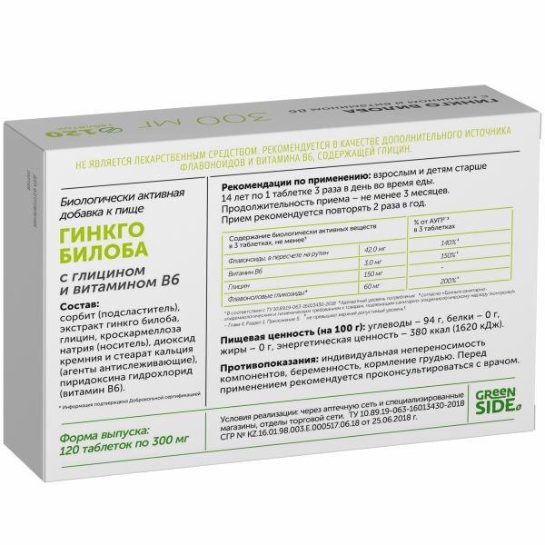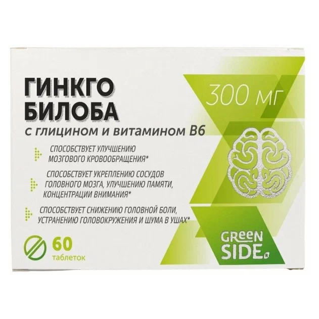 БАД "Гинкго билоба с глицином и витамином В6" способствует улучшению мозгового кровообращения, укреплению сосудов головного мозга, улучшению памяти, концентрации внимания, снижению головной боли, устранению головокружения и шума в ушах.