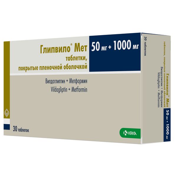 Глипвилоf£) Мет, 50 мг + 1000 мг, таблетки, покрытые плёночной оболочкой