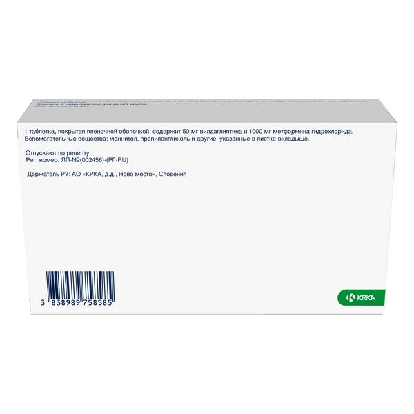 Каждая таблетка содержит 50 мг вилдаглиптина и 1000 мг метформина гидрохлорида.
