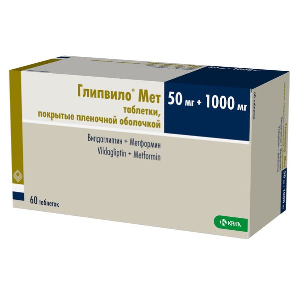 Глипвилоf£) Мет, 50 мг + 1000 мг, таблетки, покрытые плёночной оболочкой