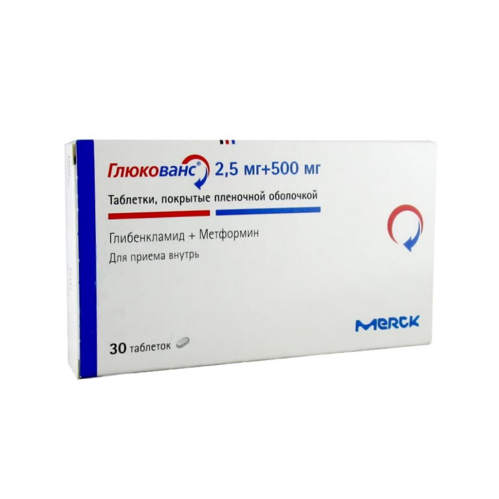 Активные компоненты: глибенкламид — 2.5 мг, метформина гидрохлорид — 500 мг.