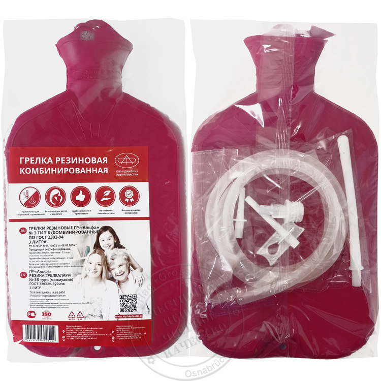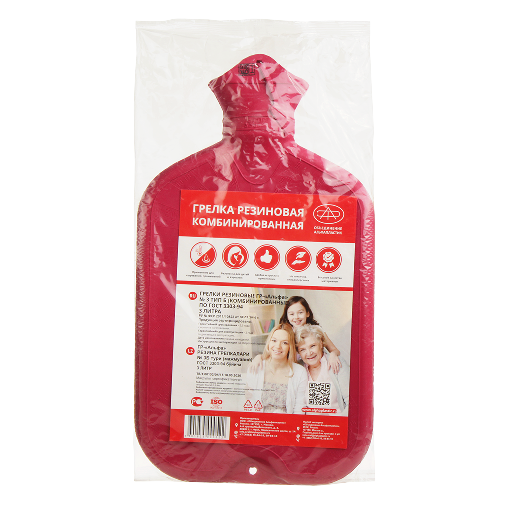 ГРЕЛКА РЕЗИНОВАЯ /ГР АЛЬФА/ТИП Б3 КОМБИНИРОВАННАЯ - упакована в индивидуальный пакет с европодвесом.