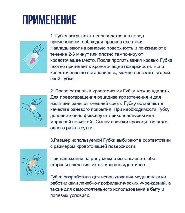 - Губку вскрывают непосредственно перед применением, соблюдая правила асептики. Накладывают на раневую поверхность и прижимают в течение 2-3 минут или плотно тампонируют кровоточащее место. После пропитывания кровью Губка плотно прилегает к кровоточащей поверхности. Если кровотечение не остановилось, можно положить второй слой Губки.
