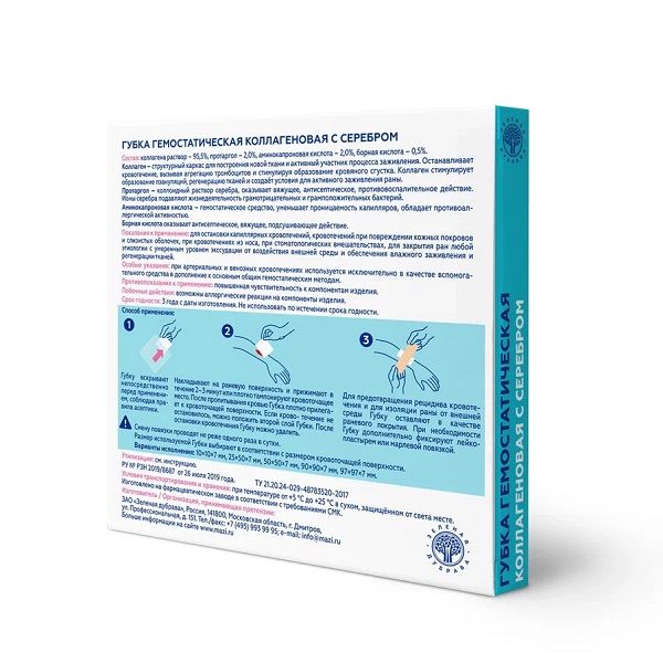 Губка гемостатическая коллагеновая с серебром — это натуральное средство скорой помощи для быстрой и надёжной остановки кровотечения. Применяется для остановки капиллярных кровотечений, кровотечений при повреждении кожных покровов и слизистых оболочек, при кровотечениях из носа, при стоматологических вмешательствах, для закрытия ран любой этиологии с умеренным уровнем экссудации от воздействия внешней среды и обеспечения влажного заживления и регенерации тканей.