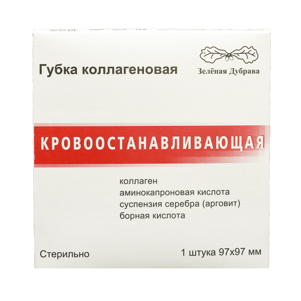 Губка коллагеновая кровоостанавливающая предназначена для применения в качестве раневого покрытия в хирургии, травматологии, дерматологии и стоматологии или в домашних условиях в качестве местного гемостатического средства при капиллярных и паренхиматозных кровотечениях, для тампонады синусов твердой мозговой оболочки, для остановки альвеолярного кровотечения после удаления зуба, для заполнения дефектов паренхиматозных органов.
